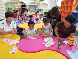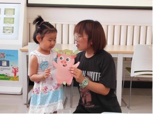 活动开始,冯老师以猜迷语的形式引出故事的主人翁——小猪。然后通过绘本PPT讲述了一只百无聊赖的小猪,就想体验别的动物的生活,用各种办法模仿长颈鹿、斑马、袋鼠、鹦鹉等动物,但全部以闹剧告终。正当它被一连串打击得快要崩溃时,受另一头猪的启发,找到了真正属于猪的快乐的故事。冯老师结合绘本讲读,带领孩子们一起为小猪进行“变形”,孩子在家长的帮助下,小猪又变成了小鱼、大象、小鸟等,丰富的活动形式让孩子们在阅读中体会,在动手中实践,懂得了要努力做最好的自己,才能获得快乐幸福。